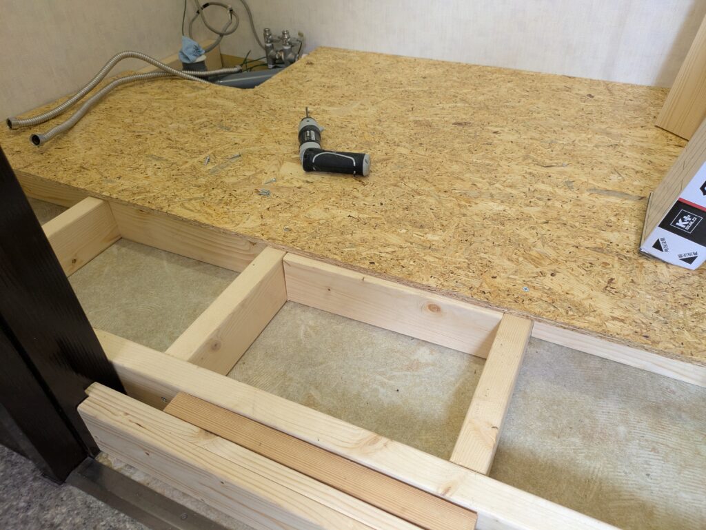 まずは、既存のキッチンを撤去し、排水管を通すための床上げ作業からスタート。